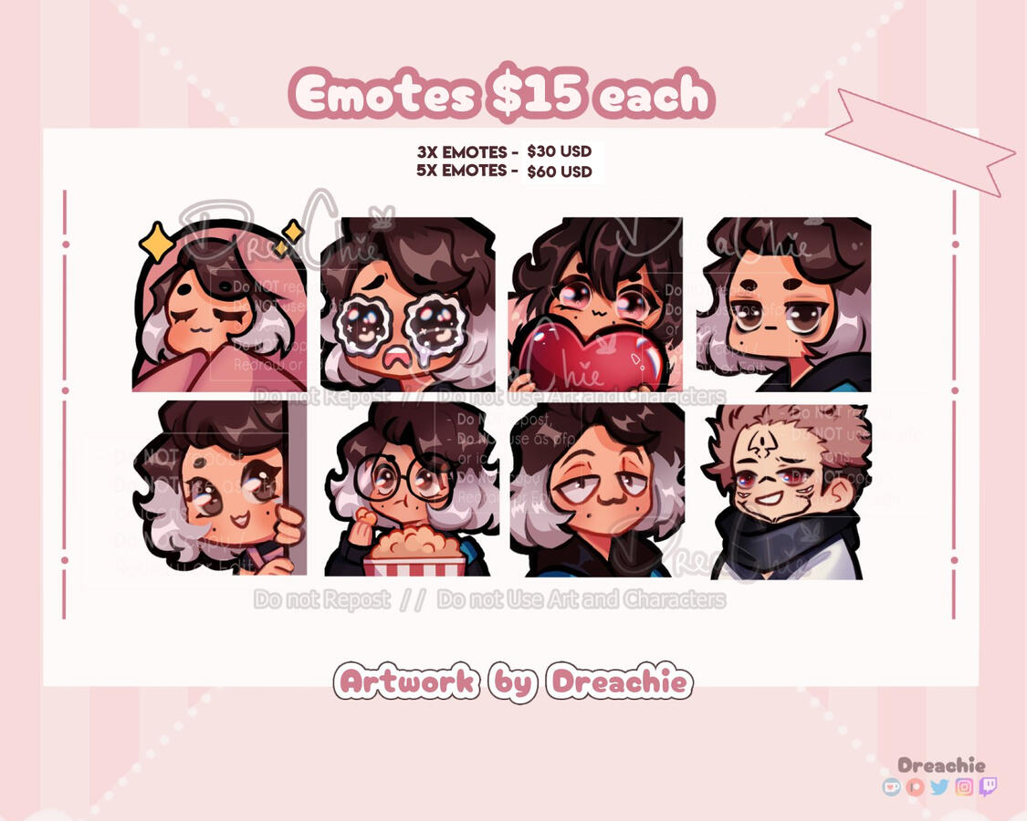 Have a clear idea of the type of emote/s you'd like! If there's some type of emote bundle or big batch you'd like to discuss about, please send me an email or contact me through my twitter or discord!